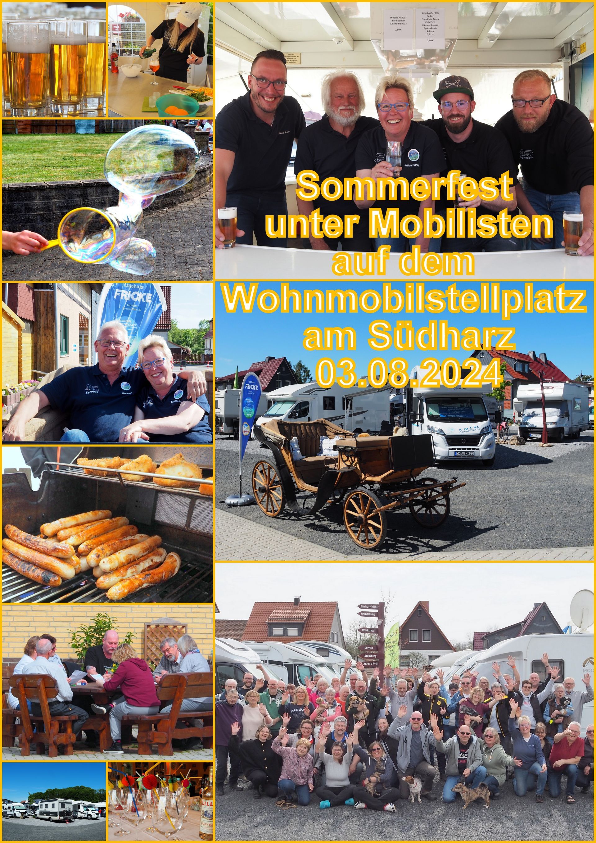03.08.2024: Sommerfest unter Mobilisten- auf dem Wohnmobilstellplatz am Südharz Wir freuen uns schon riesig auf unser Sommerfest 2024 und wollen dies auch „Sommer-Partygerecht“ mit unseren interessierten Mobilisten feiern. Die Idee unter Gleichgesinnten gemeinsam zu feiern ist uns schon in den vergangenen Jahren zu Silvester und Ostern gelungen. Mobilisten sind überwiegend sehr gesellige Menschen, kommen mit neuen Menschen gut in Kontakt, haben immer viel zu erzählen über ihre Reiseerlebnisse und das Leben selbst. So freuen wir uns am 03.08.24 mit unseren angemeldeten Gästen ein freudiges, zünftiges Sommertreffen zu gestalten. Gemütliches Beisammensein, nette Gespräche sommerliche Getränke und Speisen sind sicherlich die Hauptmerkmale. Am Nachmittag werden alle viel Freude bei einer spaßigen Spielchallenge auf unserem Gelände haben. Eine Spielchallenge mit einem Mix aus einfachen Spielen, lustigen Spielen, abwechslungsreich und unterhaltsam. Am Ende wird es sicherlich einen Gewinner / Gewinnerpaar geben mit dem Vermerk, dass wir gleichzeitig alle gewonnen haben durch das riesige Erlebnisspiel. Lasst Euch überraschen. Den Abend genießen wir gemeinsam mit stimmigen Cocktails, kühlen Bier oder Wein, leckerer Grillware, Salate, und mal sehen was uns sonst noch so einfällt. In lustiger Stimmung genießen wir den Abend bis in die Nacht am Lagerfeuer mit Stockbrot. Mit etwas Glück können wir vielleicht die Sterne am Himmel zählen und Sternzeichen beobachten. Das wird bestimmt ein tolles Fest. Eure Svenja und Uwe Wir freuen uns auf Eure Anmeldung. Weitere Infos und Reservierungen unter 05521-99770, oder 0171-4360442, Mail: info@autohaus-fricke.de