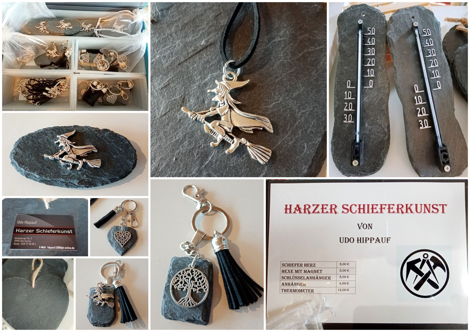 Schiefergestein ist auch immer wieder ein beliebtes Material. Udo Hippauf aus Bad Sachsa gestaltet damit wahrlich nette Artikel. Egal ob Thermometer, Schlüsselanhänger, Herzen die individuell beschriftet werden können und vieles mehr. Tolle Nutz,- & Geschenkartikel, die man bei uns auf dem "Wohnmobilstellplatz am Südharz" erwerben kann.